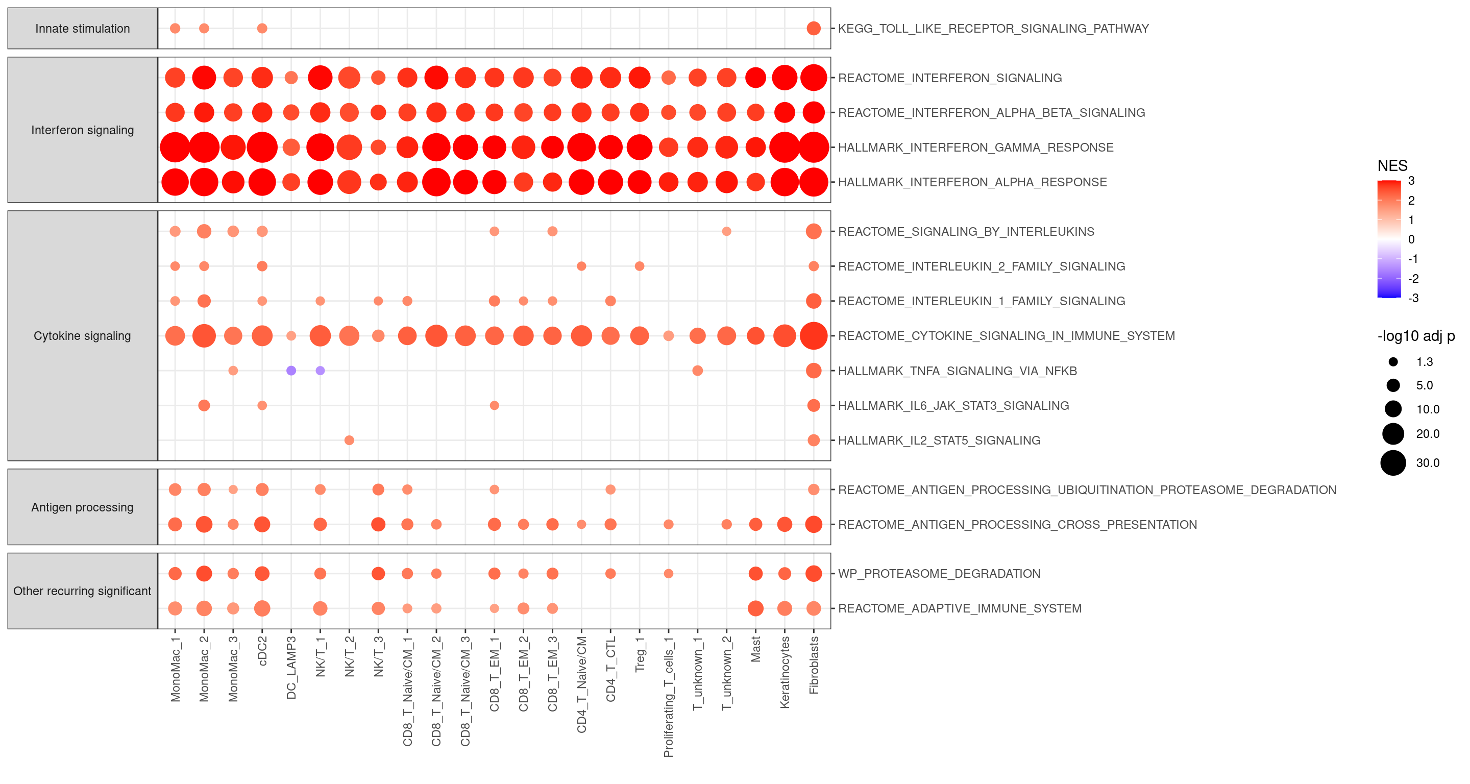 names(recurring_topSigPathways) <- rep("Other recurring significant",length(recurring_topSigPathways))11.12 Plot dot plot of NES and p-value for pathways of interest