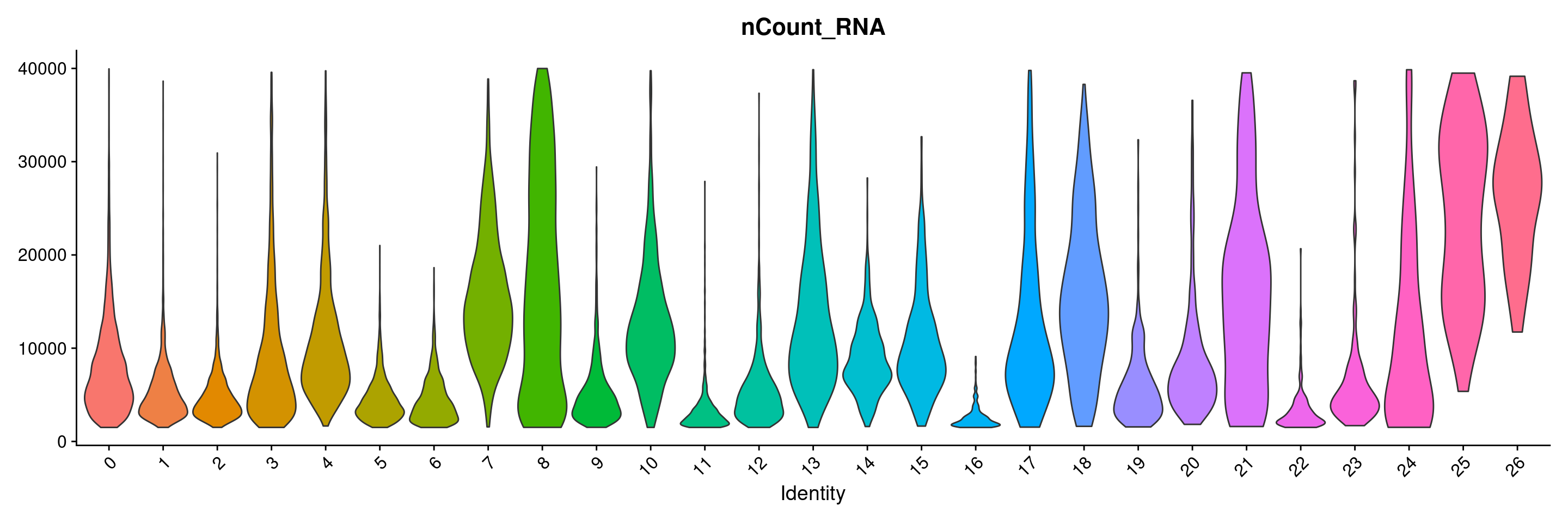 VlnPlot(merged.18279.skin.singlets, features = "nCount_RNA", group.by="seurat_clusters",pt.size=0) + NoLegend()