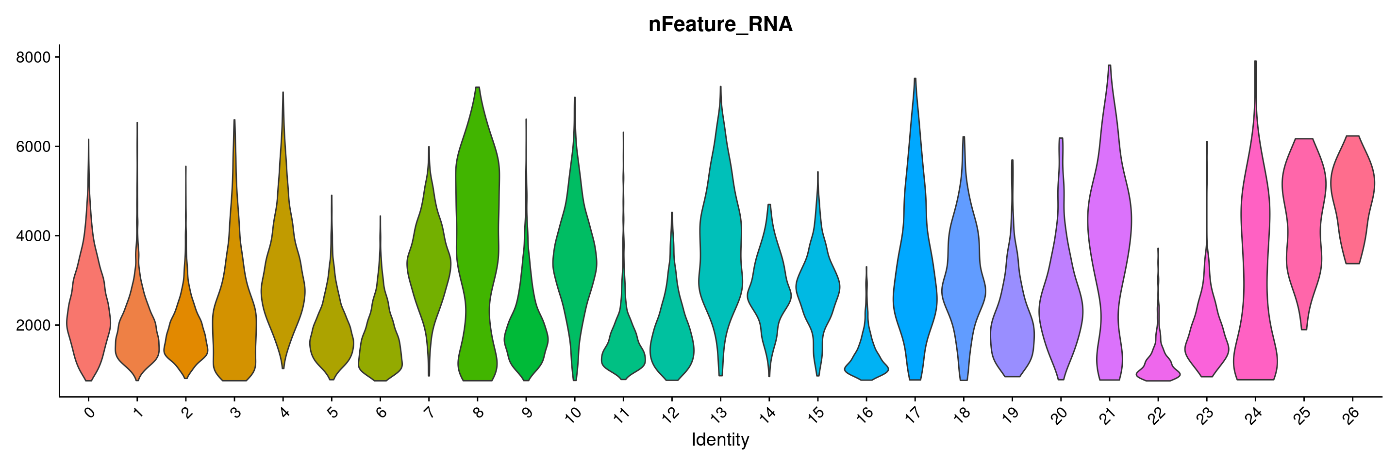 VlnPlot(merged.18279.skin.singlets, features = "nFeature_RNA", group.by="seurat_clusters",pt.size=0) + NoLegend()