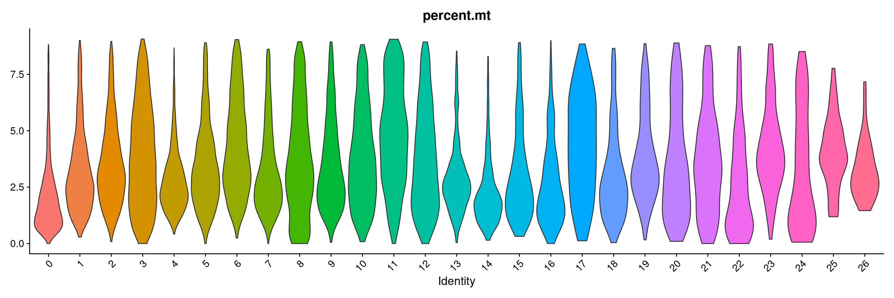 VlnPlot(merged.18279.skin.singlets, features = "percent.mt", group.by="seurat_clusters",pt.size=0) + NoLegend()