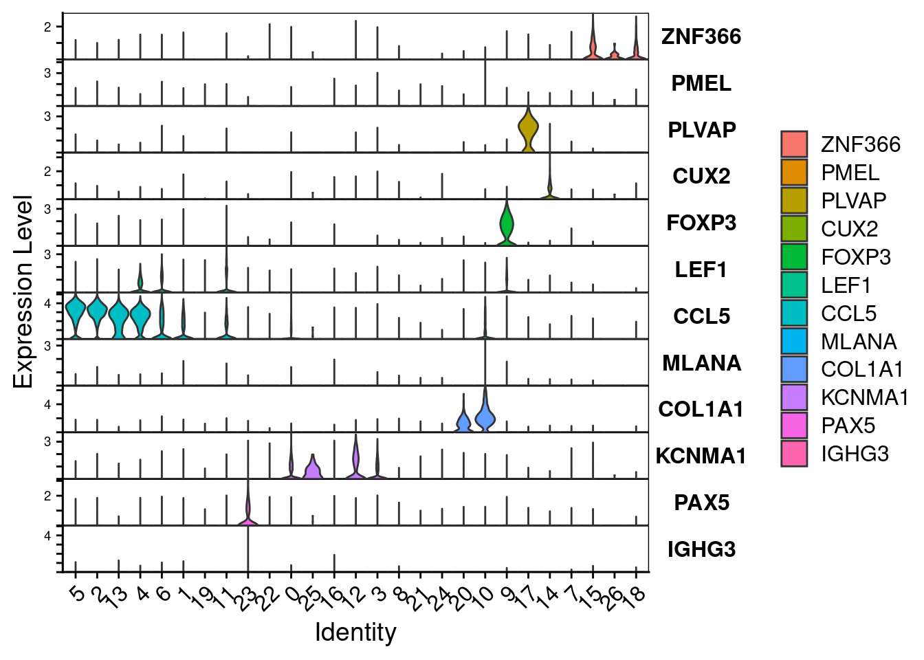 top_vargenes <- top_markers(vargenes, n = 5, auc_min = 0.5, pct_in_min = 50, pct_out_max = 50)