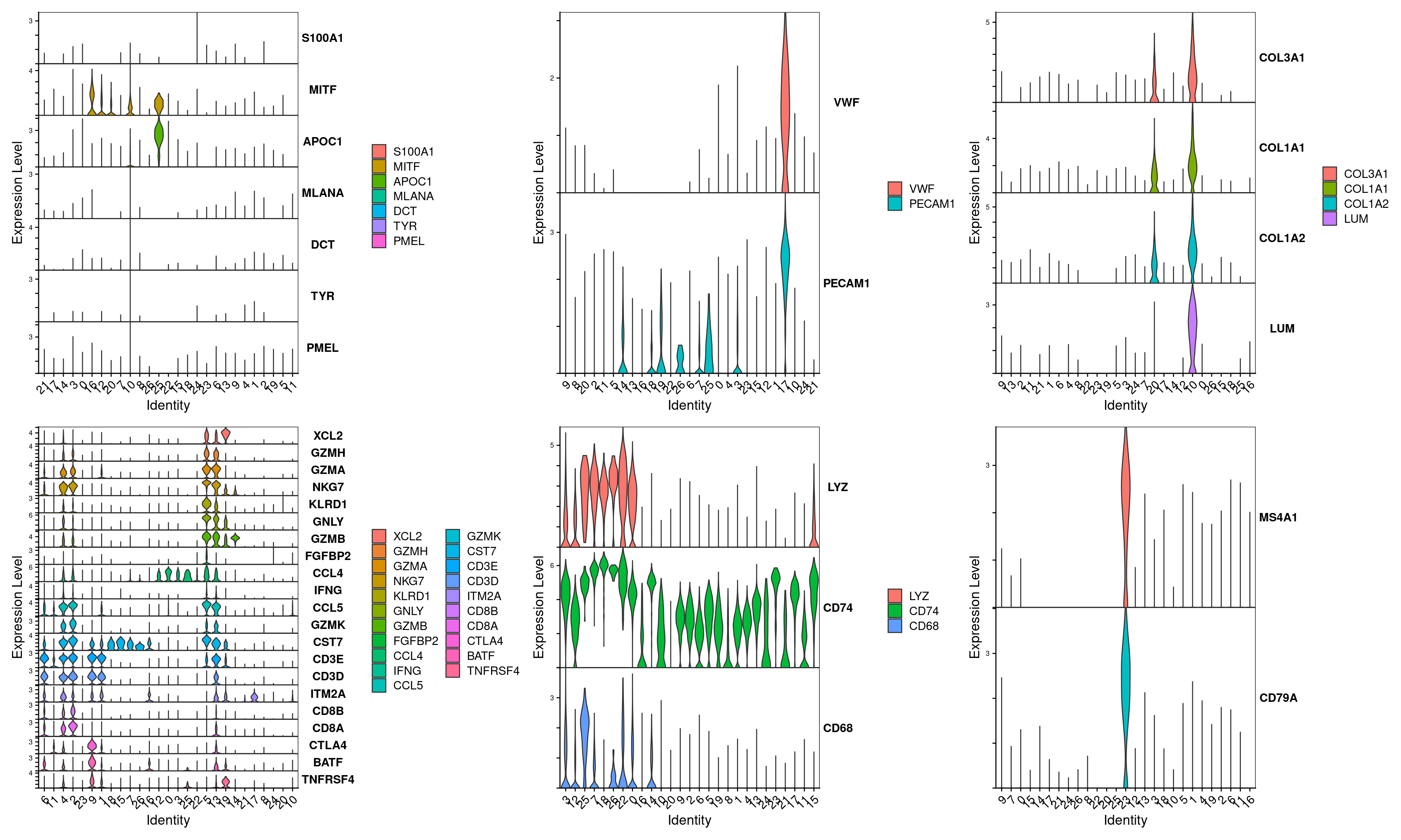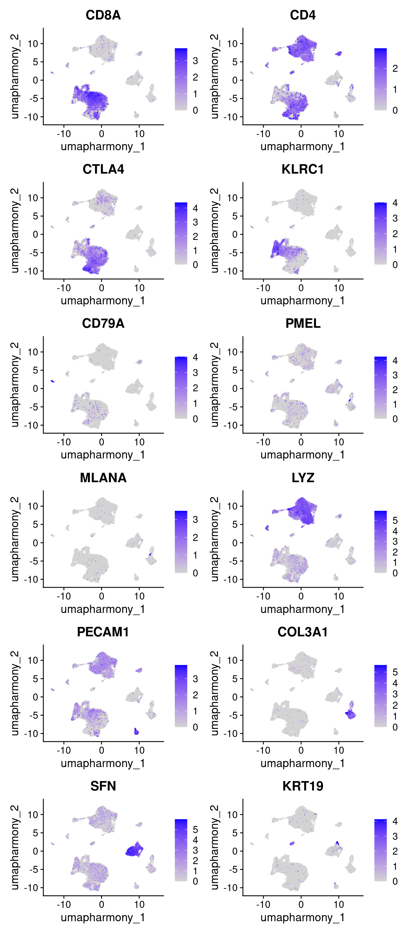 features=c("CD8A","CD4","CTLA4","KLRC1","CD79A","PMEL","MLANA","LYZ","PECAM1","COL3A1","SFN","KRT19"),