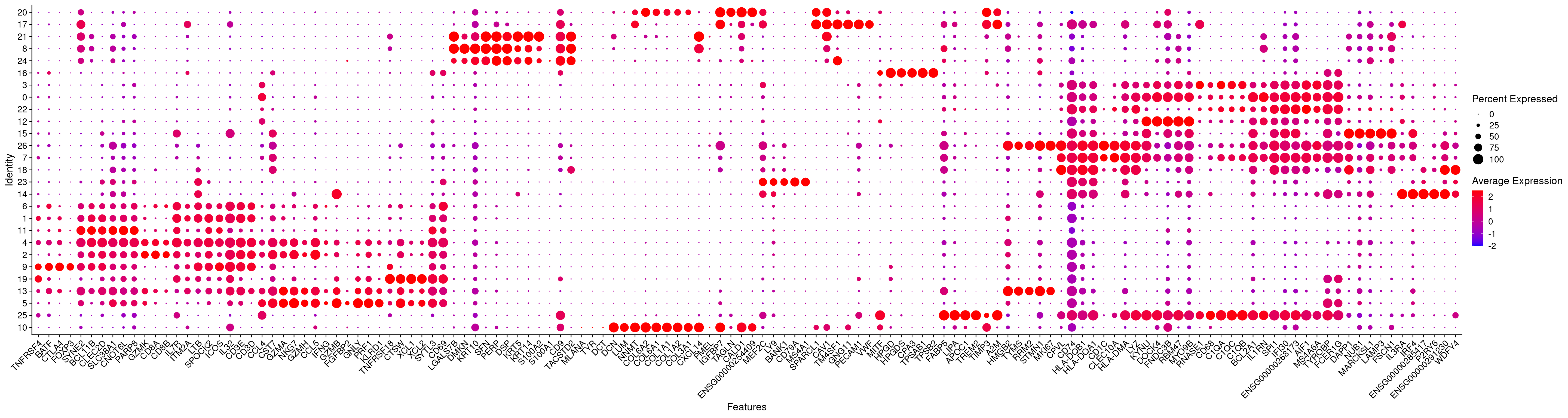 DotPlot(merged.18279.skin.singlets,features=dotplotmarkers.sorted,assay="RNA",cols=c("blue","red"),cluster.idents=T) + RotatedAxis()