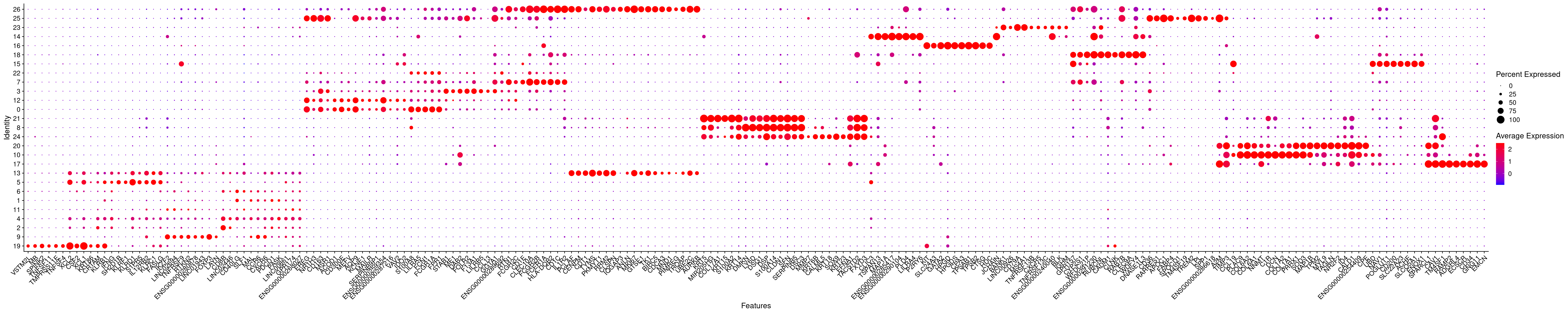 dplyr::filter(pct.1 > 0.25 & diff > 0.1 & pct.2 < 0.1 & p_val_adj < 0.01) %>%